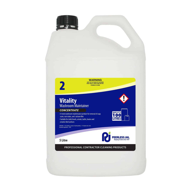 Vitality is an organic formula acidic washroom cleaner that removes soap scum from baths, showers, hand basins and tile surfaces, and calcium, verdigris and rust stains from toilet bowls and urinals.