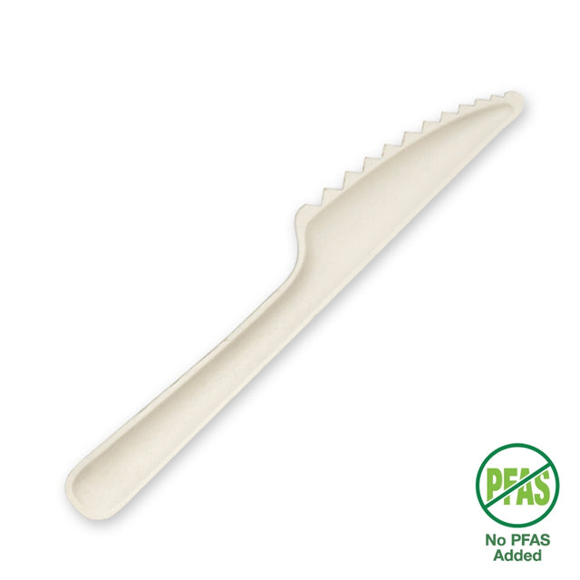 Our sugarcane knife is made from rapidly renewable sugarcane pulp, a by-product of the sugar refining industry. Bagasse cutlery is certified home compostable to Australian AS5810 standards, made with no added PFAS.