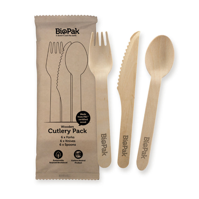 These disposable cutlery sets have been packaged for retail sale and are shelf-ready. Each pack contains 6 wooden forks, 6 knives, and 6 spoons. There are 20 eco-friendly cutlery packs per carton.