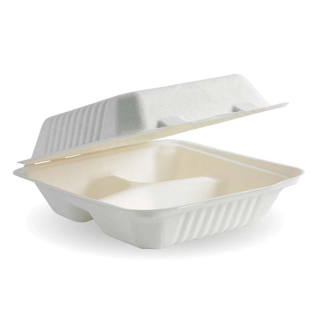 Our plastic-free clamshells are made from rapidly renewable sugarcane pulp, a by-product of the sugar refining industry. Our 7.8x8x3" 3-compartment white bagasse clamshell containers are an eco-friendly alternative to plastic takeaway containers.