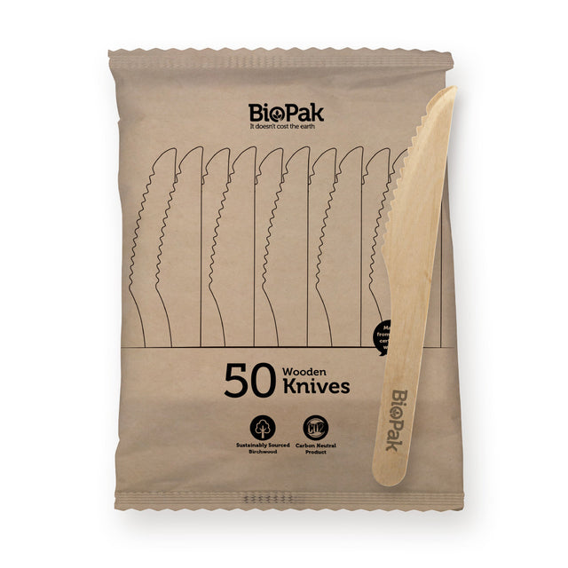 16cm wood knife is made from sustainably sourced FSC™ 100% certified birchwood. These takeaway knives are compostable. A more eco-friendly alternative to plastic knives. These wooden knives are packaged for retail.